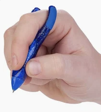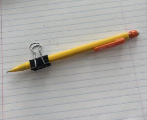 The poor man’s version of the Twist ‘N Write involves the use of an ‘elephant clip’ on a typical pencil. Much less expensive, better eraser, and provides a nearly similar level of support. Do note the bent thumb and index finger. Suggest beginning with the Twist ‘N Write and transitioning to the elephant clip.